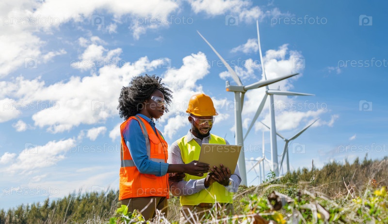 Инженеры используют цифровые технологии для контроля технического обслуживания ветряных турбин.Сгенерированное изображение