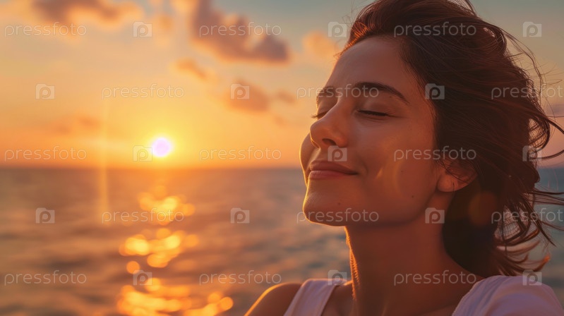 Молодая женщина наслаждается безмятежной красотой заката на природе.Сгенерированное изображение