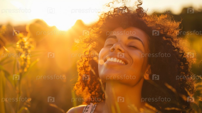 Молодая женщина наслаждается безмятежной красотой заката на природе.Сгенерированное изображение
