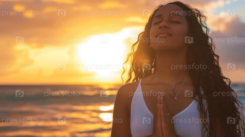 Молодая женщина наслаждается безмятежной красотой заката на природе.Сгенерированное изображение