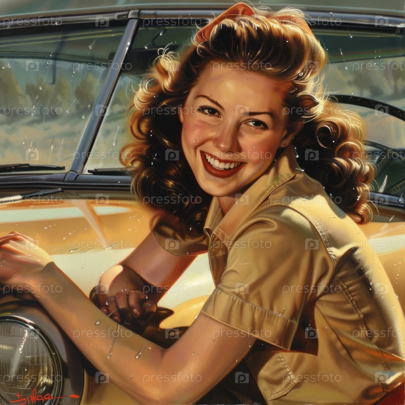 Улыбающаяся женщина-механик полирует машину в мастерской.Сгенерированное изображение