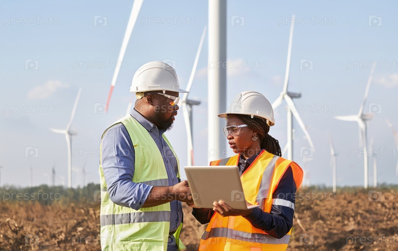 Инженеры используют цифровые технологии для контроля технического обслуживания ветряных турбин.Сгенерированное изображение