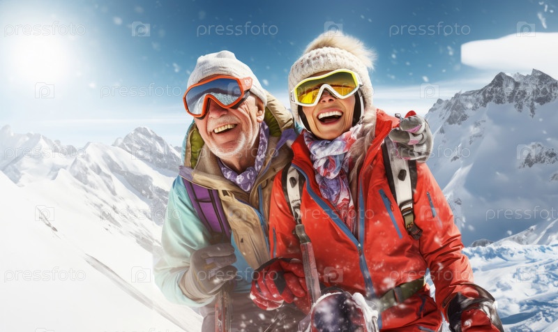 Пожилая пара в горнолыжном снаряжении разделяет трогательный момент, наслаждаясь радостью зимы и непреходящим теплом своей альпийской любви.Сгенерированное изображение