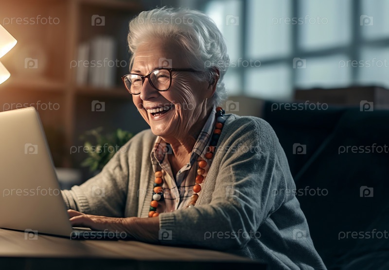 Сияющая пожилая женщина наслаждается теплом своего дома, улыбается, работая за ноутбуком, и наслаждается комфортом современных технологий