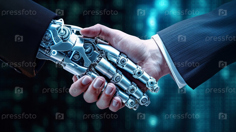 В футуристическом слиянии бизнеса и технологий бизнесмен уверенно пожимает руку роботизированной руке, символизируя инновации и сотрудничество