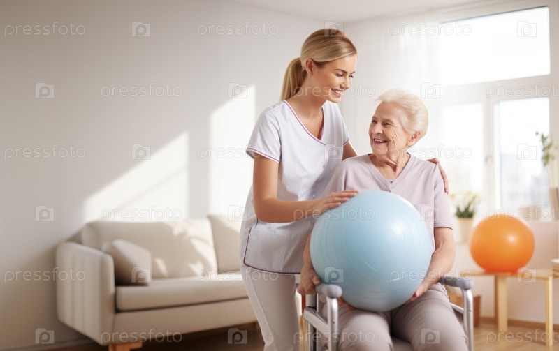 Медицинский работник выполняет лечебные упражнения с пожилой женщиной в инвалидной коляске, используя мяч и различные вспомогательные средства, демонстрируя пример сострадательного ухода и реабилитационной поддержки в сфере здравоохранения