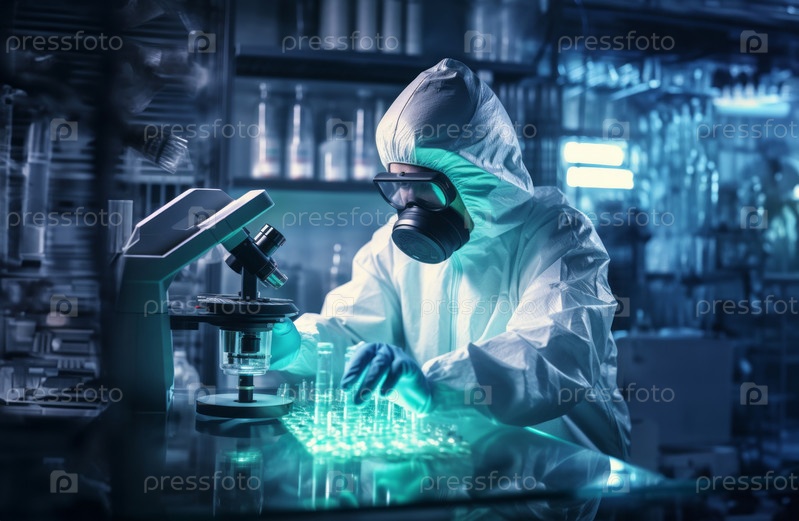Таинственный доктор в костюме исследует опасные материалы с помощью микроскопа в профессиональной офисной обстановке