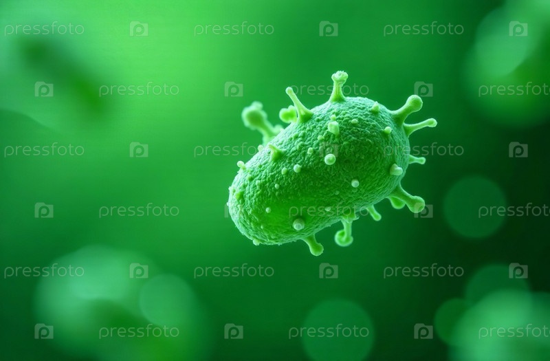 Вирусы и микробы, движущиеся на зеленом фоне, абстрактная иллюстрация. Генеративный искусственный интеллект
