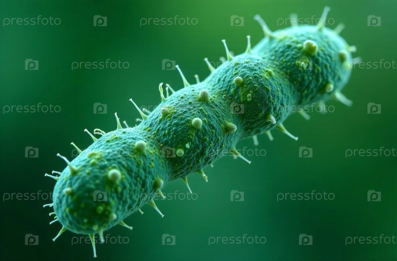 Вирусы и микробы, движущиеся на зеленом фоне, абстрактная иллюстрация. Генеративный искусственный интеллект