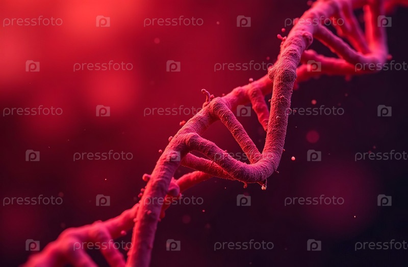 ДНК спираль вращается на красном фоне, генетика биология клетка. Генеративный искусственный интеллект