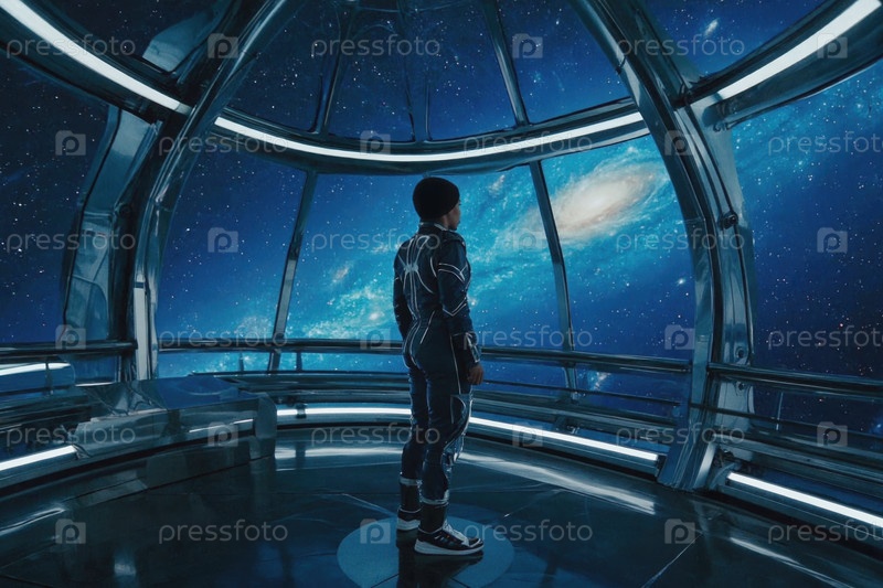 Скафандр и шлем астронавта в космическом корабле, вид из окна. Генеративный искусственный интеллект
