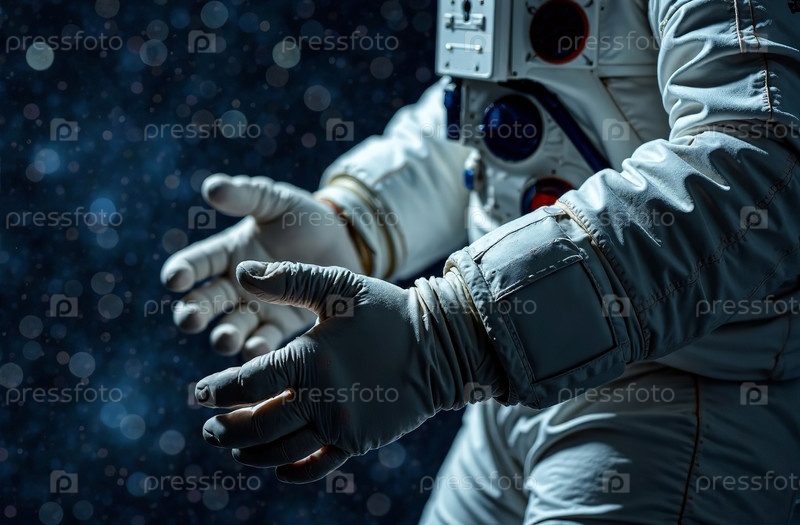 Астронавт скафандр открытый космос летит невесомость крупным планом руки. Генеративный искусственный интеллект