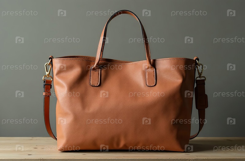 Макет женской коричневой сумки на сером фоне. Генеративный искусственный интеллект