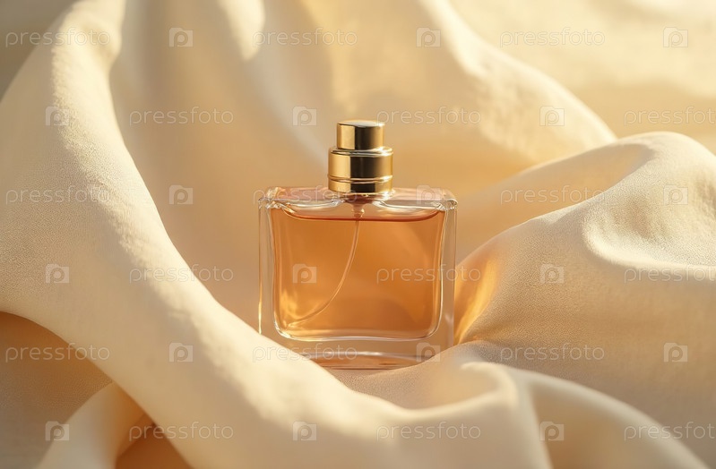 Макет прозрачной стеклянной упаковки для духов в бежевой ткани. Генеративный искусственный интеллект