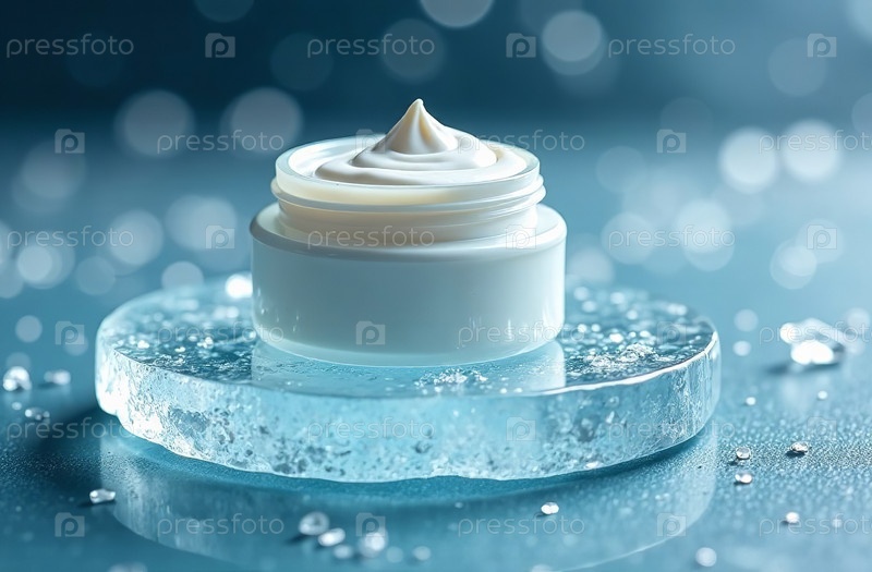 Макет белой тюбиковой баночки для косметики в кусочках льда. Генеративный искусственный интеллект