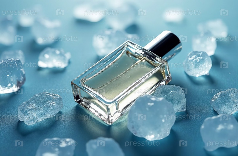 Макет прозрачной стеклянной упаковки для духов в кусочках льда. Генеративный искусственный интеллект