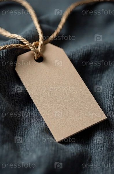 Картонная бирка, привязанная соломенной нитью к серой ткани. Генеративный искусственный интеллект
