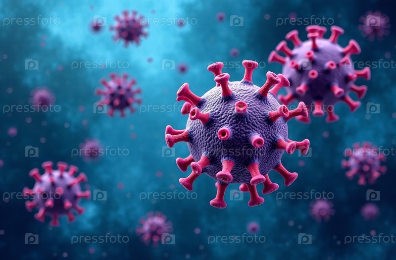 Вирусы и микробы, движущиеся на синем фоне, абстрактная иллюстрация. Генеративный искусственный интеллект