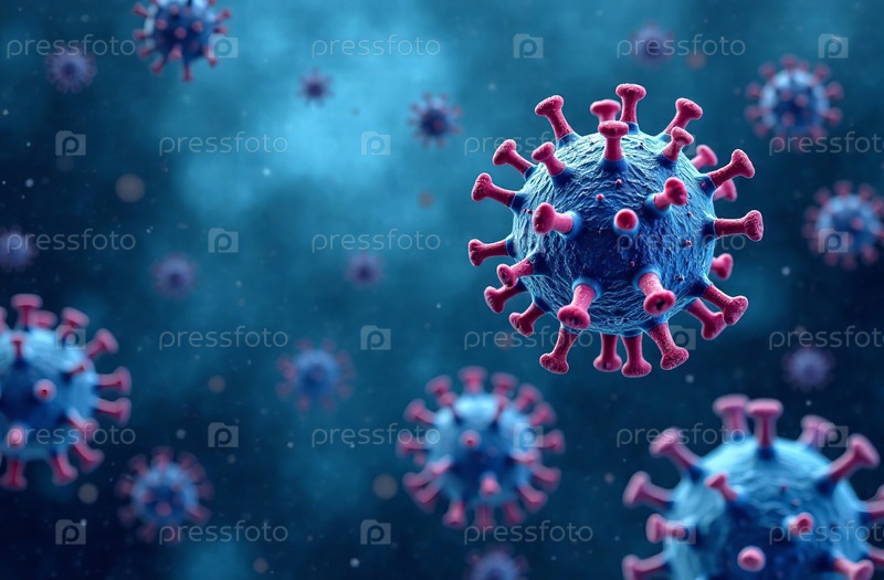 Вирусы и микробы, движущиеся на синем фоне, абстрактная иллюстрация. Генеративный искусственный интеллект