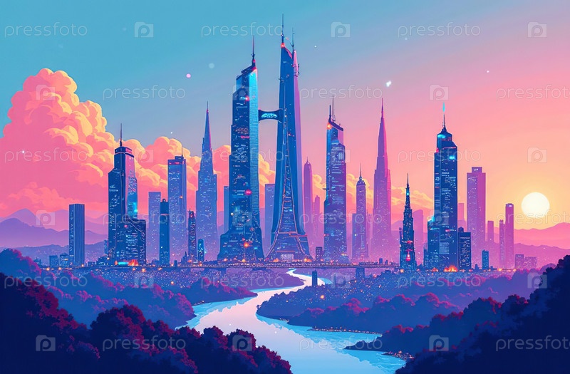 Футуризм, научная фантастика, кибергород, панорама, виртуальная реальность. Генеративный ИИ