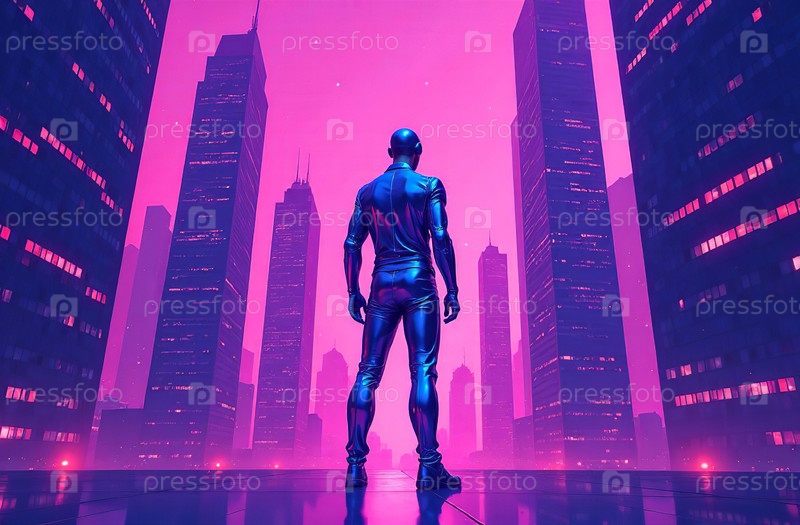 Человек на фоне Футуризм кибергород, панорама виртуальная реальность. Генеративный ИИ
