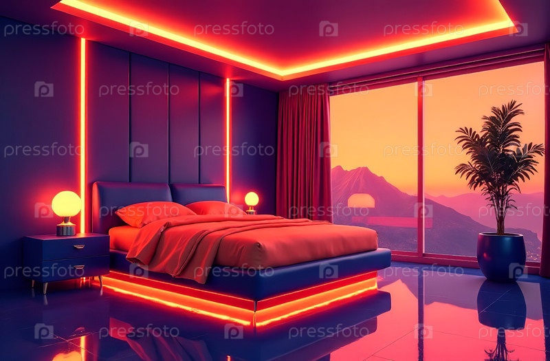 Ретрофутуристский интерьер здания, свободное пространство спальни. Генеративный искусственный интеллект
