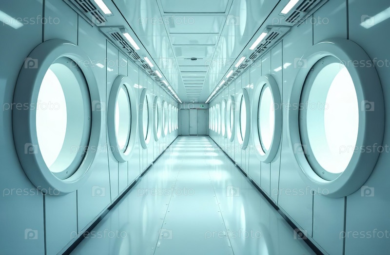 Ретрофутуризм интерьер здания, свободное пространство коридора. Генеративный ИИ
