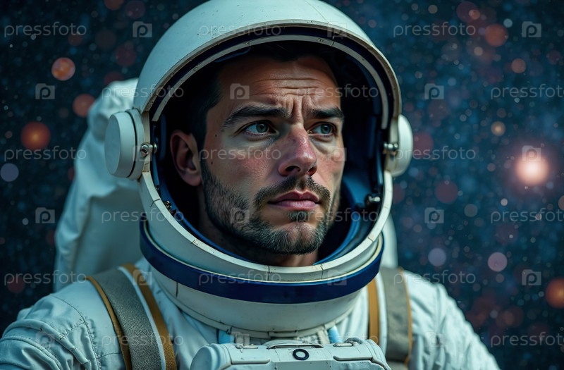 Портрет мужчины-астронавта в шлеме скафандра на фоне космоса. Генеративный искусственный интеллект