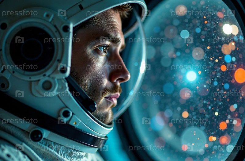 Портрет мужчины-астронавта в шлеме скафандра на фоне космоса. Генеративный искусственный интеллект