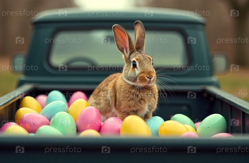 Пасхальный кролик и разноцветные яйца в багажнике пикапа. Генеративный ИИ