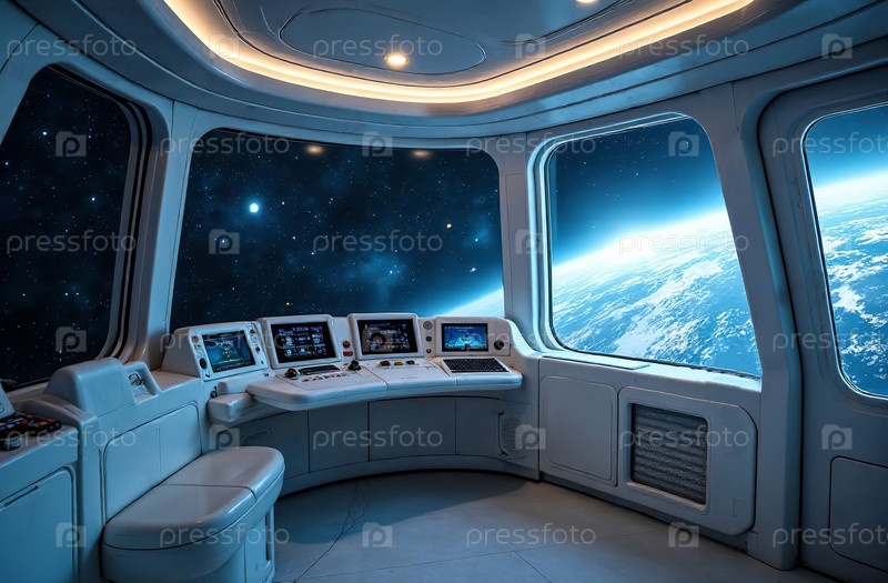 Интерьер космического корабля, космос и планеты в окне. Генеративный ИИ
