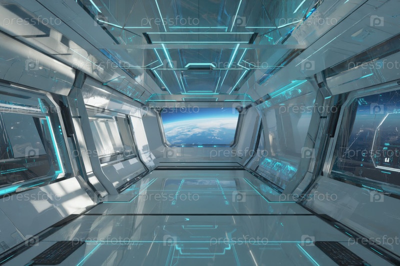 Интерьер космического корабля, космос и планеты в окне. Генеративный ИИ