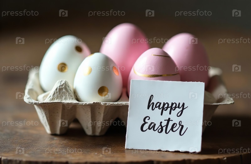 Красочные яйца в подносе на столе, открытка с Пасхой. Генеративный искусственный интеллект