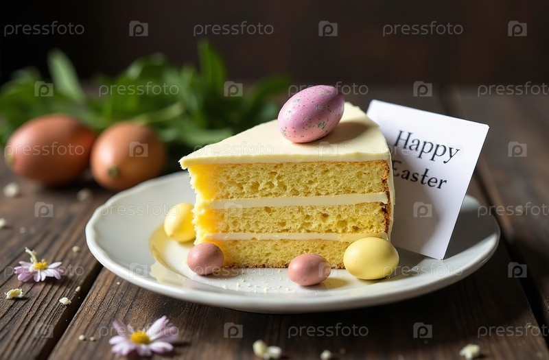 Пасхальный кулич, разноцветные яйца на украшенном столе, открытка с Пасхой. Генеративный искусственный интеллект