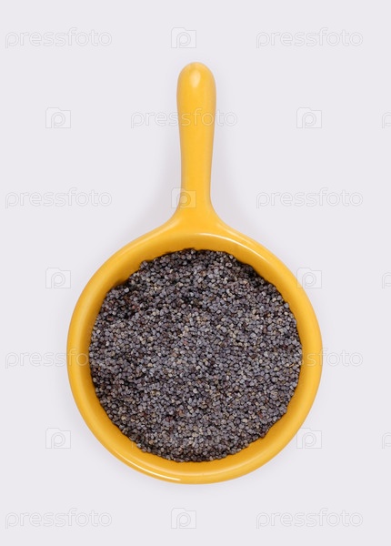 Небольшая пробная порция сухого мака на блюде, изолированном на белом фоне. Элемент дизайна с обтравочным контуром