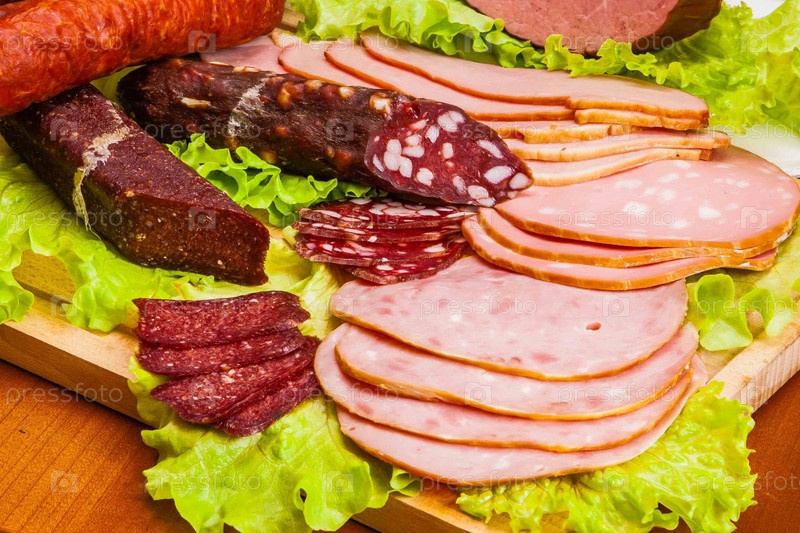 Мясные деликатесы (ветчина, колбаса) на деревянной доске