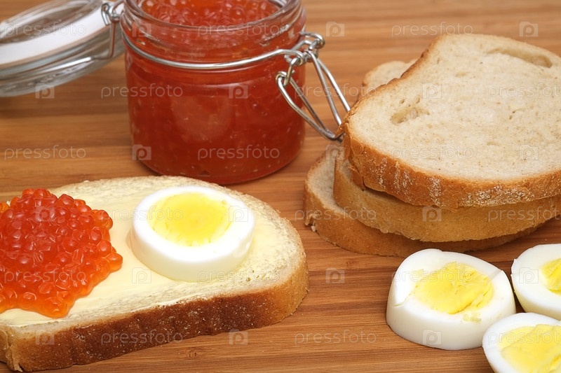 Сэндвич с красной икрой и яйцом в разных ракурсах