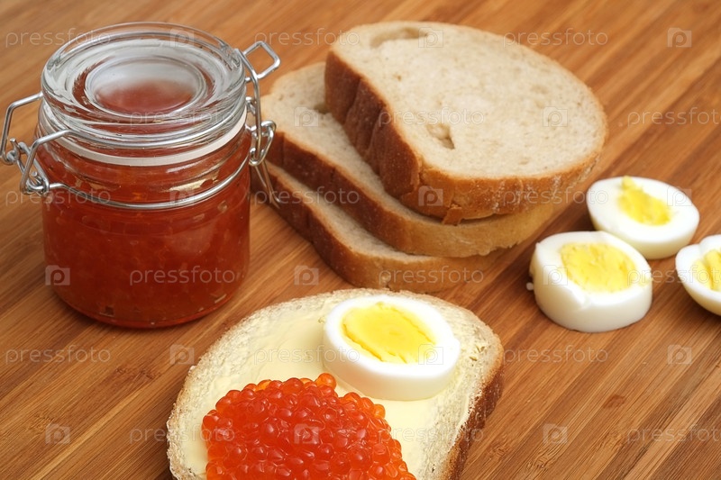 Сэндвич с красной икрой и яйцом в разных ракурсах