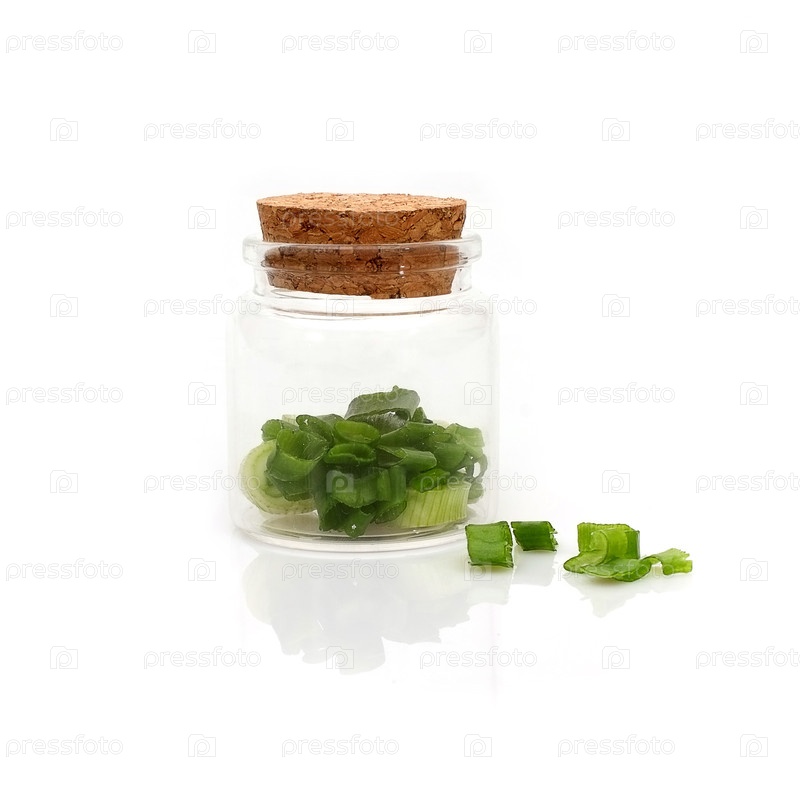 Нарезанный зеленый лук в прозрачной стеклянной банке на белом фоне