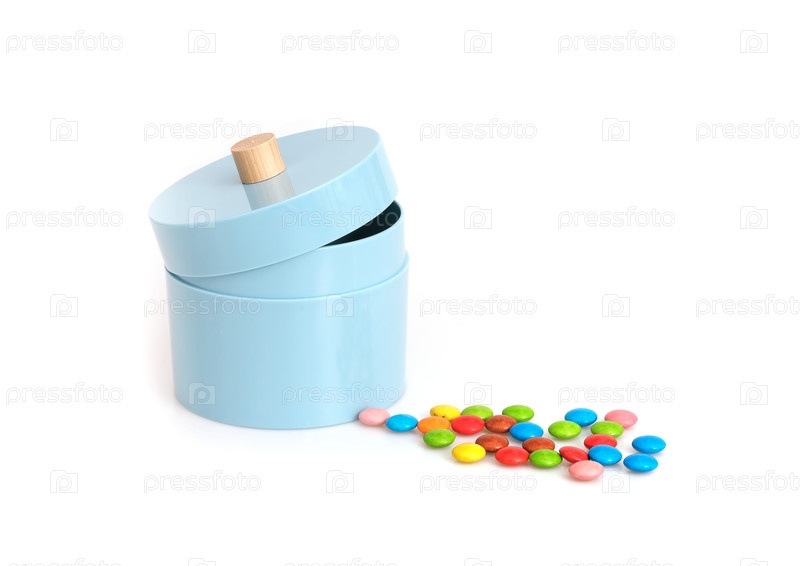 Цветные маленькие конфеты высыпались из банки, изолированной на белом фоне