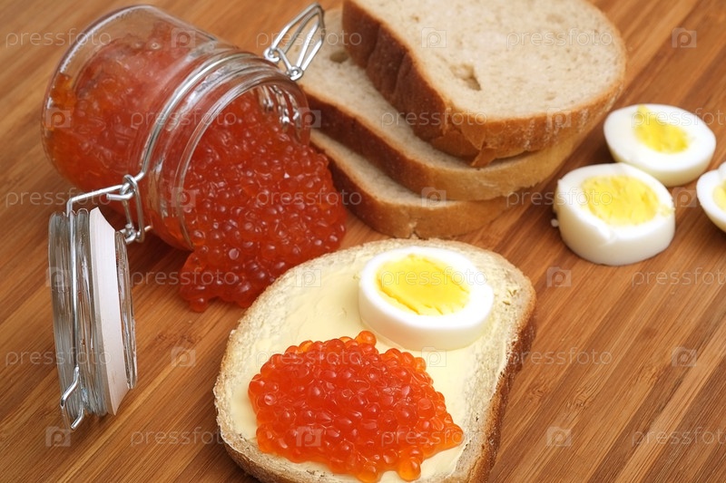 Сэндвич с красной икрой и яйцом в разных ракурсах