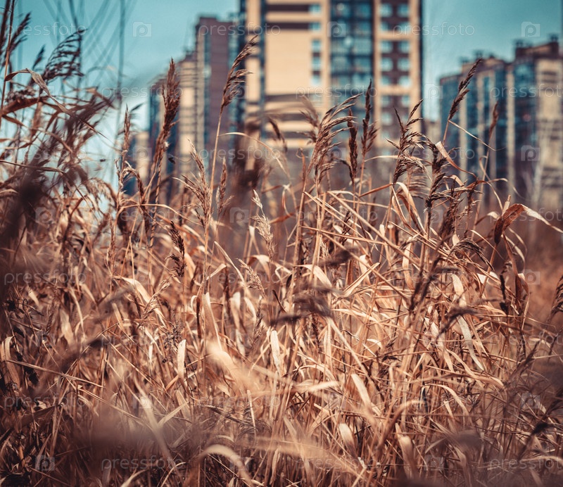 Тростник обыкновенный, или тростник южный, очерет (лат. Phragmítes austrális) на фоне многоэтажных домов
