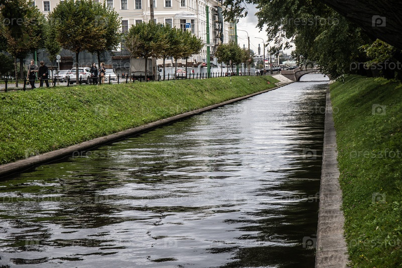 Канал в парке летнего сада крупным планом летом