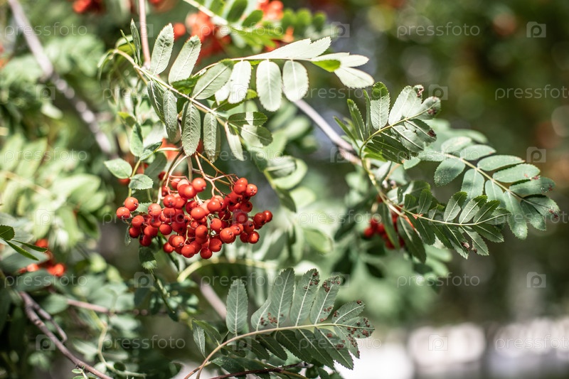 Осенние деревья желтого цвета под солнцем крупным планом. Рябина