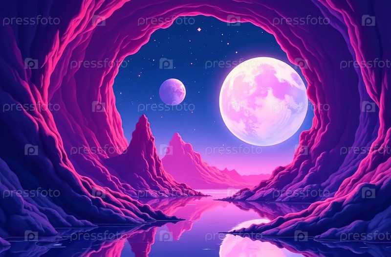 Ландшафт планета большой спутник ретро футуризм гора панорама. Генеративный ИИ