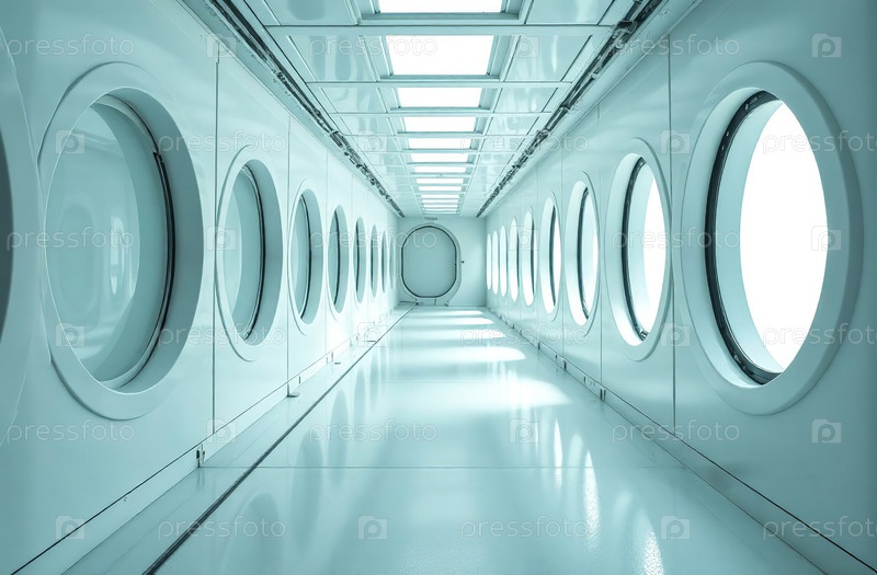 Ретрофутуризм интерьер здания, свободное пространство коридора. Генеративный ИИ