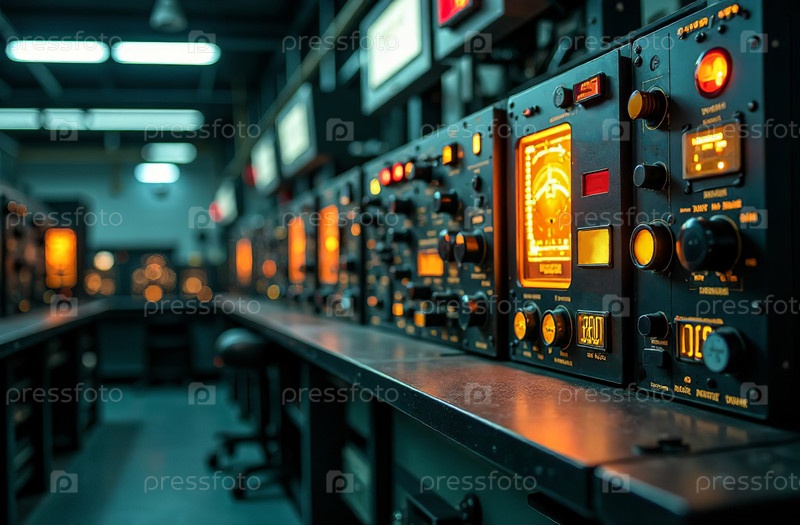 Ретрофутуристский интерьер здания, свободное пространство серверной комнаты. Генеративный ИИ
