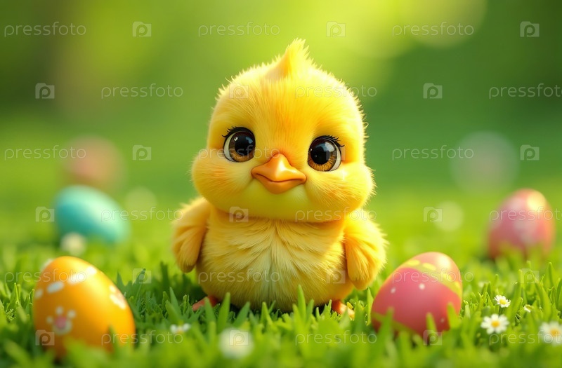 Куры и красочные пасхальные яйца на зеленом лугу. Генеративный искусственный интеллект