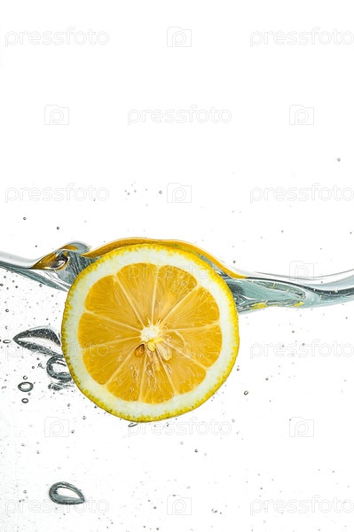 Лимон падает в воду с пузырьками (изолированный фон-макет)