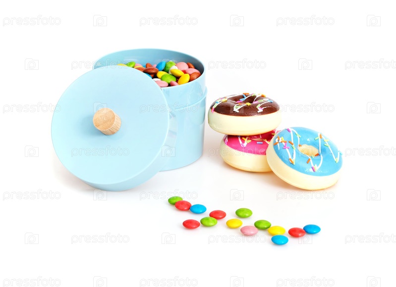 Цветные маленькие конфеты высыпались из банки, изолированной на белом фоне